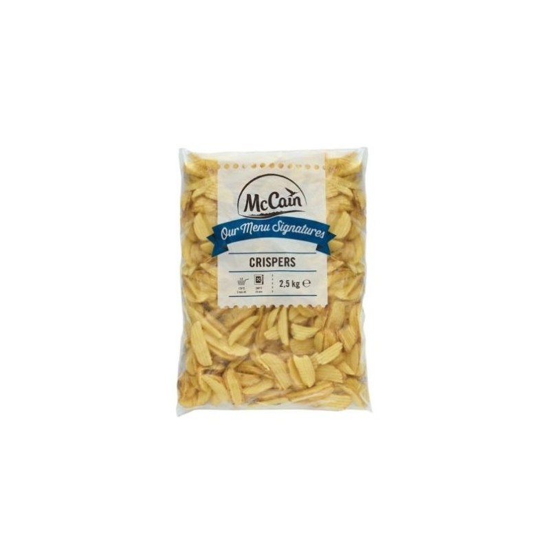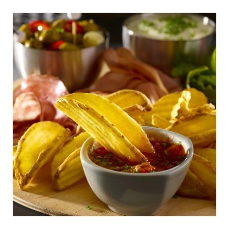 Pommes de terre avec peau, salées, coupées en forme de V, avec un enrobage croustillant. Préfrites et surgelées. 2,5kg