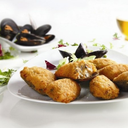 Coquille de moule farcie à la béchamel avec des morceaux de chair de moule galicienne elle-même et une frite, recouverte d'une légère panure.