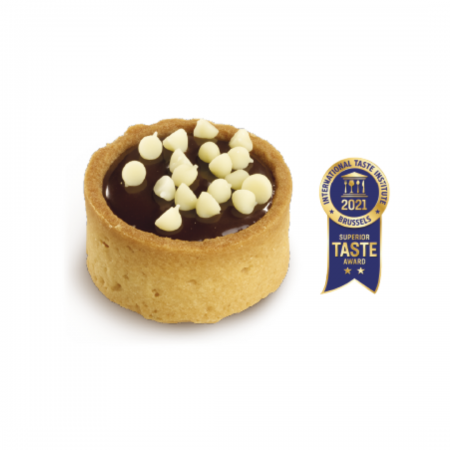 Tartelette avec un délicieux biscuit sablé, fourrée au chocolat Belge et finie avec des perles de chocolat blanc x8