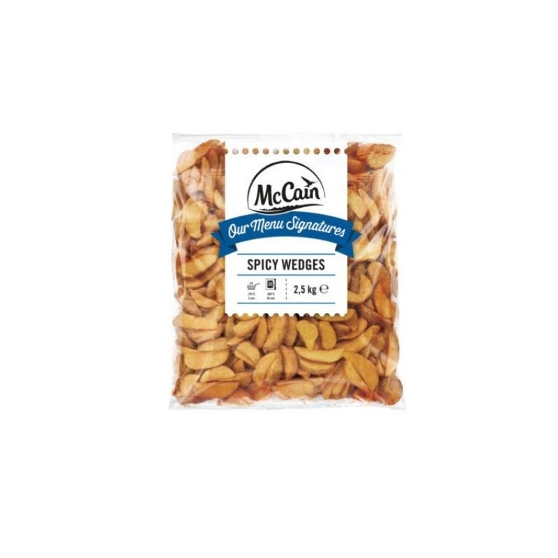 Quartiers de pommes de terre avec peau, enrobés d’une préparation épicée croustillante. Préfrits et surgelés. 2,5kg
